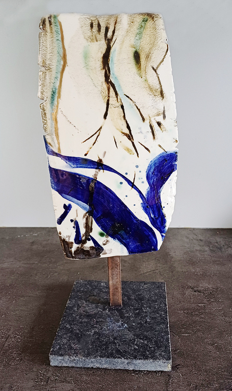 La céramique faïence et porcelaine que j’utilise comme une toile en deux cuissons, tout d’abord avec des oxydes et enfin l’émaillage, ceci dans un registre abstrait. Toutes mes sculptures sont signées BRITTON (en hommage à ma mère).
